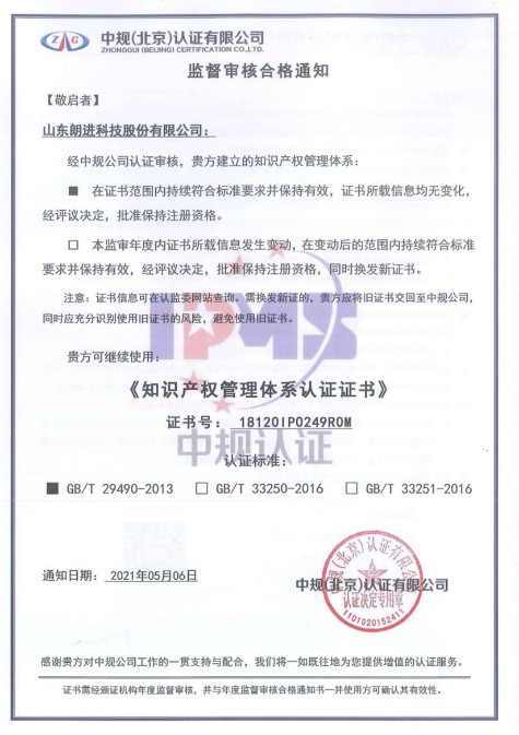 2021年5月6日,朗进科技收到中规(北京)认证有限公司签发的《监督审核合格通知书》,批准公司知识产权管理体系保持认证证书注册资格。这标志着公司知识产权体系管理经过一年的运行,符合体系管理的规范化要求,通过体系审核认证。
