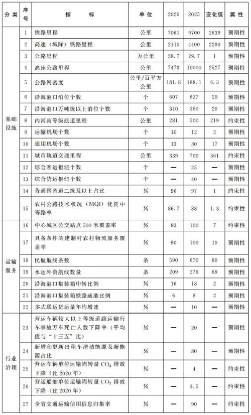 (1)高速公路。以实施“加密、扩容、提速、增智”四大工程为抓手,新建、改扩建高速公路近4000公里,进一步提升高速公路网连接效能和通达水平。到2025年,高速公路通车及在建里程达到10000公里,省际出口超过30个,双向六车道及以上占比达到36%,基本实现县(区、市)有两条以上高速通达。