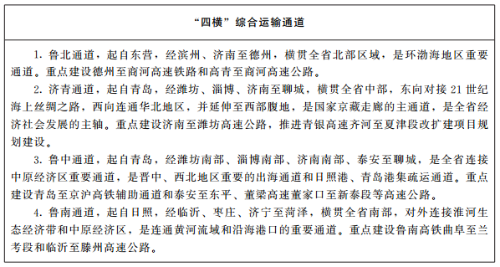 1.完善四横五纵通道。积极融入国家京津冀—长三角主轴、京哈走廊和京藏走廊。在基本形成鲁北、济青、鲁南三个横向通道基础上,加快完善鲁中横向通道,提升沿海港口辐射能力和西向铁水联运效能,积极融入共建“一带一路”高质量发展;在基本形成沿海、京沪辅助、京沪、京九四个纵向通道基础上,加快完善滨临纵向通道,强化与京津冀、长三角区域连接。