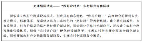 (3)农村公路。开展“五年提质增效”专项行动,实施路网提升、道路通达、通行安全保障、融合发展样板、运输服务升级“五大工程”,助推乡村振兴。新建改造提升农村路4万公里,因地制宜推进通建制村双车道公路建设和过窄农村公路拓宽改造,打造“四好农村路”乡村振兴齐鲁样板。路网提升工程。提升新建公路路面结构和技术标准,到2025年底,具备条件的县(市、区)中心城区与所辖乡镇实现二级及以上公路连接,相邻乡镇实现三级及以上公路连接。强化路域环境治理,因地制宜设置停车区、服务驿站等配套服务设施,完善既有农村公路的安全、排水、绿化等配套设施建设。道路通达工程。推动农村公路向进村入户倾斜,持续推进村内通户道路硬化,打通断头路。到2025年,所有自然村全部通硬化路,村内通户道路硬化基本完成,高标准实现“村村通”“户户通”。通行安全保障工程。完成现有四、五类桥梁改造任务。实施1万公里村道安全设施提升试点。加快完善农村公路安全防护设施,基本消除县乡道路安全隐患。融合发展样板工程。加强农村公路与自然、生态、文化、科技、产业等融合发展,探索“公路+”发展模式,开展最美农村路、乡村振兴路命名活动。到2025年,打造80条特色鲜明、带动作用大的省级以上融合发展样板公路。运输服务升级工程。具备条件的地区推行全域公交,形成城乡一体、高效快捷、功能完善的农村物流网络体系。