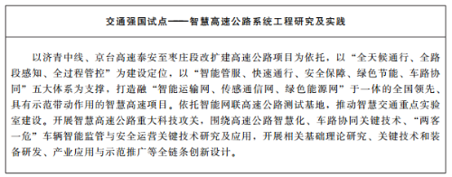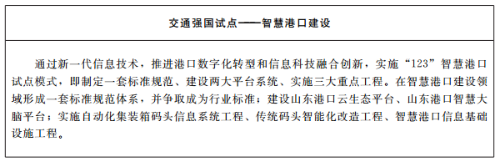 2.建设两个智慧化试点工程。按照新基建部署要求,推进交通运输信息化向数字化、网络化、智能化发展,推动“交通链”向“数据链”转变。加快以智能设施、车路协同、船岸协同等技术为特征的“智慧高速”“智慧港口”两个试点工程建设。开展交通强国“智慧高速公路系统工程研究及实践”试点,实施济青中线、京台高速泰安至枣庄段智慧高速公路项目,在路网感知、车路协同、信息化管服等方面实现新突破;利用滨莱高速原址保留路段,打造全国首个面向无人驾驶的智能网联高速公路封闭测试基地。完善国家干线公路视频监测网络,深化电子不停车收费系统(ETC)门架应用,推进高精度数字化基础设施地图和交通基础设施信息库建设,实现视频、气象、事件检测等信息云上汇聚、全省网联。开展交通强国智慧港口试点,实施自动化集装箱码头、传统码头智能化改造工程和智慧港口信息化建设,打造世界领先的新一代智慧港口。
