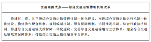(1)深化体制机制改革。完成“综合交通运输体制机制改革”交通强国试点任务,优化完善机构职能,深入推进交通运输综合执法改革。持续探索交通运输主管部门对重点交通运输企业履行业务指导和监管职能的新模式,完善行业指导监管机制,构建事权清晰、有机衔接、政令畅通、协同高效的一体化综合交通运输体制机制。