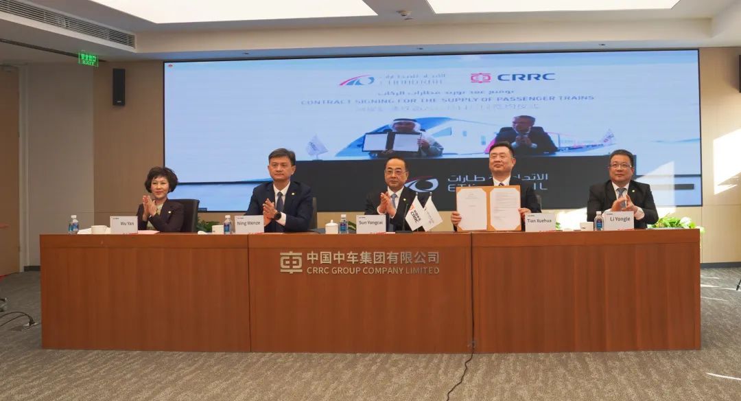 签约仪式在北京和阿布扎比两地以视频连线的方式举行。中国驻阿联酋大使馆公使周飙、中国中车董事长孙永才共同见证了签约仪式。中车四方股份公司董事长田学华、阿提哈德铁路公司CEO沙迪·马拉克代表双方在合同上签字。