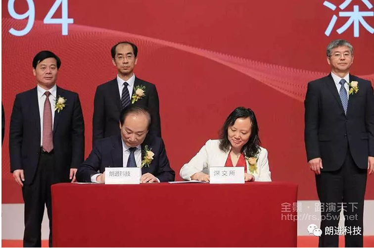 深交所总工程师喻华丽女士与朗进科技公司董事长李敬茂先生签署了《证券上市协议》