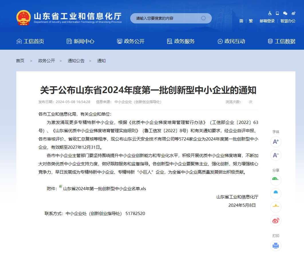 2024年5月8日,山东省工信厅发布文件通知,朗进科技被列入“山东省2024年度第一批创新型中小企业”。
