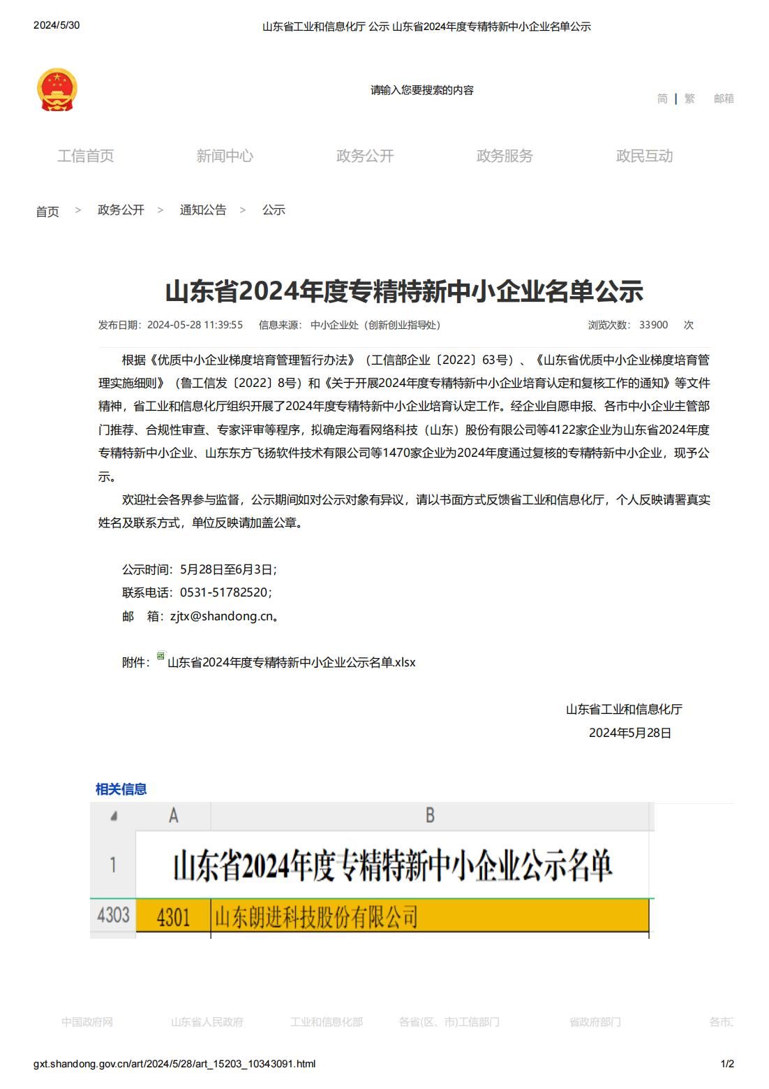 根据山东省工业和信息化厅文件公告,朗进科技成功通过山东省2024年度专精特新中小企业复审,这标志着公司在专业领域的技术实力、创新能力以及市场竞争力得到了进一步的认可和肯定。